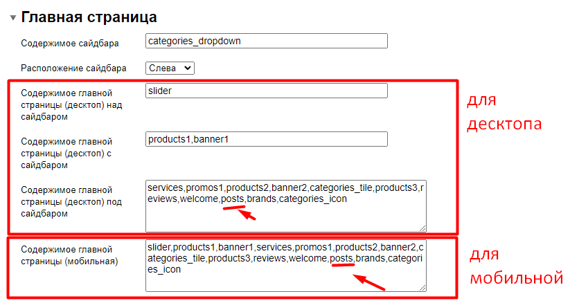 3) Под сайдбаром опция - Содержимое главной страницы (десктоп) под сайдбаром: