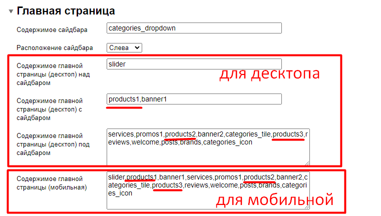 3) Под сайдбаром опция - Содержимое главной страницы (десктоп) под сайдбаром: