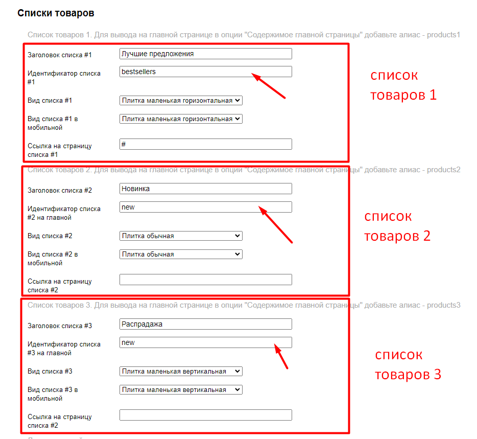 На главной странице можно вывести 3 списка товаров. Для этого необходимо в опциях Содержимое главной страницы прописать алиасы products1 - для первого списка, products2 - для второго списка, products3 - для третьего списка: