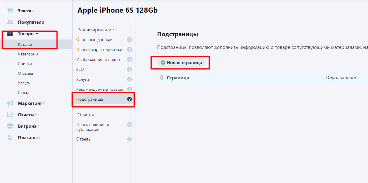 5. Для вывода индивидуальной дополнительной вкладки в карточке товара, необходимо создать Страницу в настройка товара, в разделе Подстраницы: