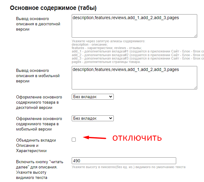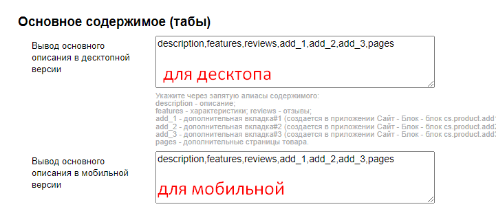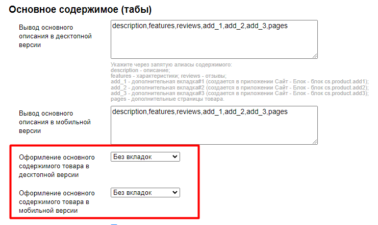 1. Вывод разделов в основном содержимом карточки товара управляются через опцию Вывод основного описания (раздел "Карточка товара" / "Основное содержимое (табы)"). В опции в нужном порядке перечисляются (через запятую, без пробелов) алиасы разделов: