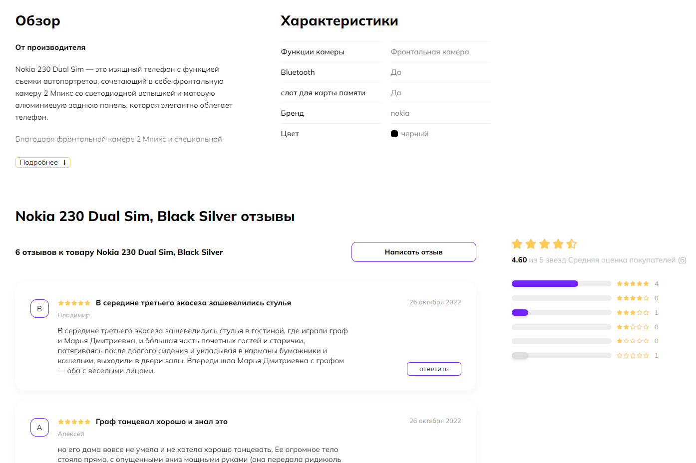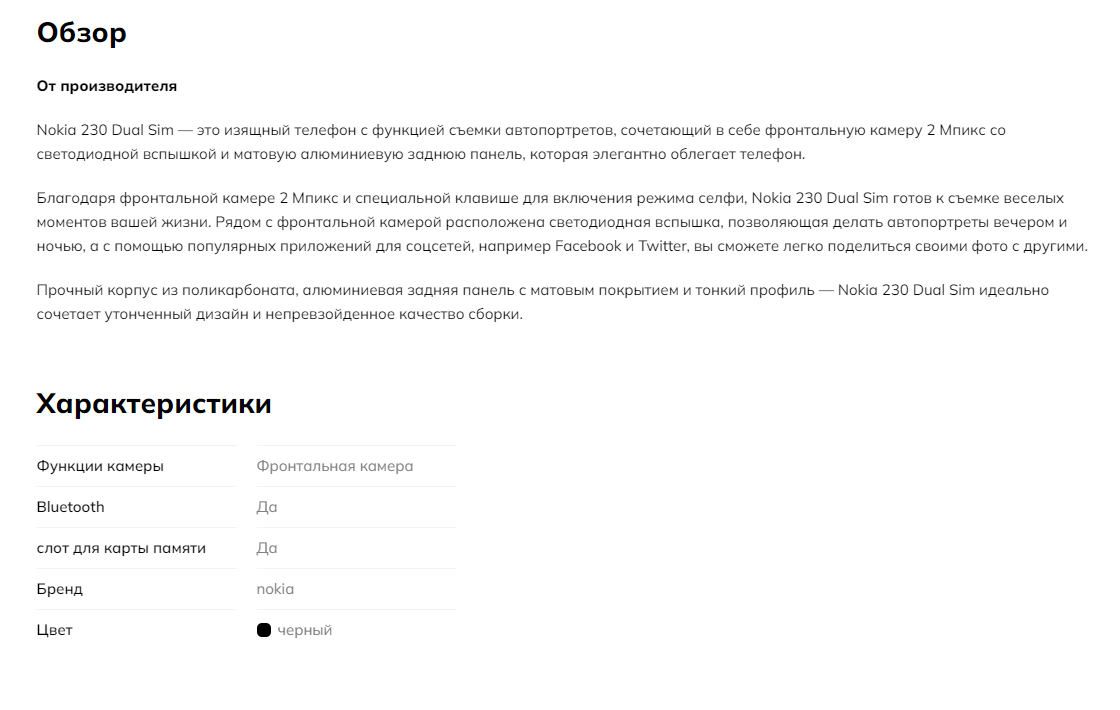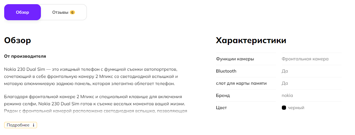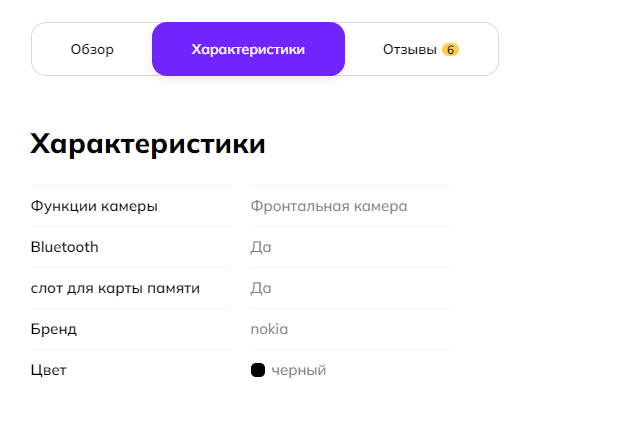В варианте отображения секций без вкладок, характеристики расположатся под Обзором: