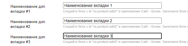 4. В основное содержимое карточки товара можно вывести до 3х вкладок с произвольным содержимым (алиасы add_1, add_2 и add_3). В настройках темы дизайна заполните заголовки дополнительных разделов: