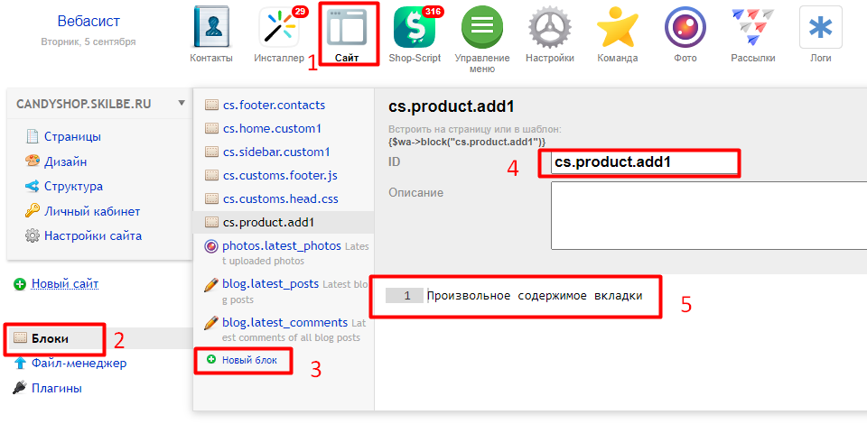 Далее, в приложении Сайт - Блоки - создайте блоки с ID: