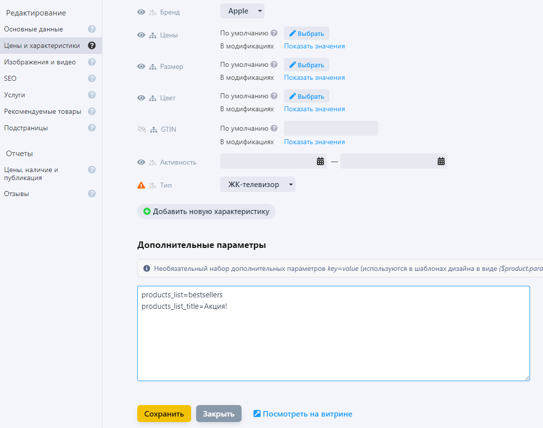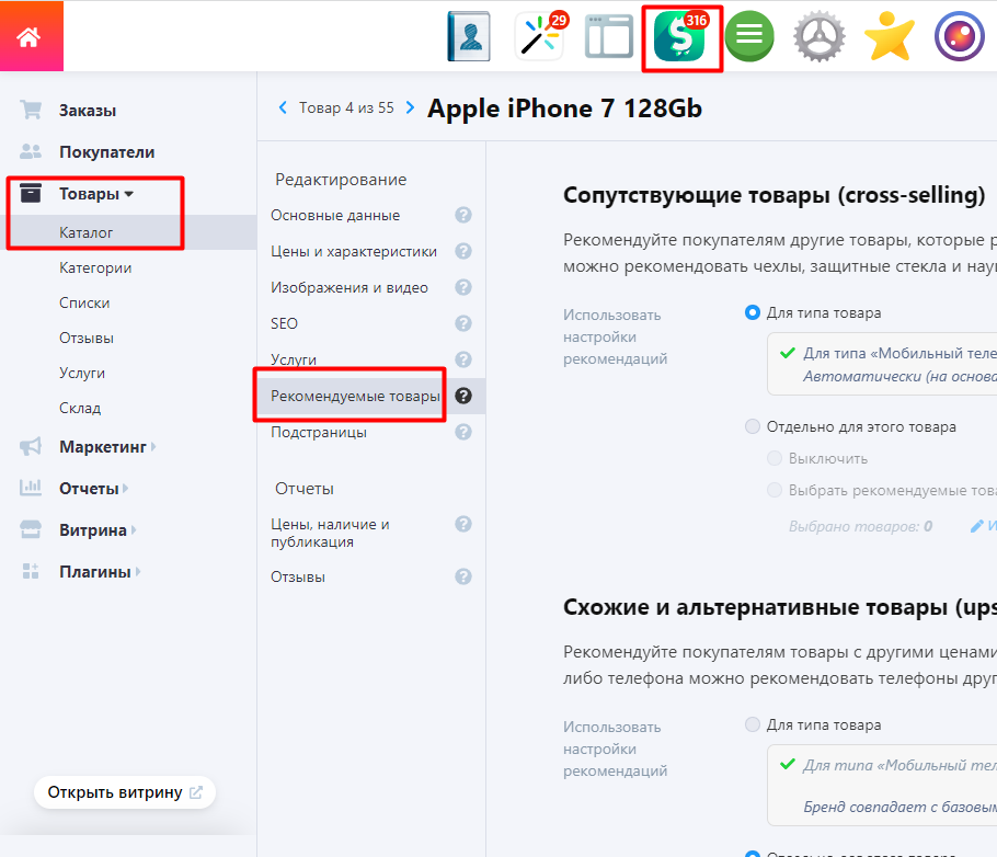 2. Далее, список Рекомендуемых и Перекрестных товаров настраиваются в настройках Товара, в приложении Магазин - Товары - Каталог - Товар - вкладка "Рекомендуемые товары":