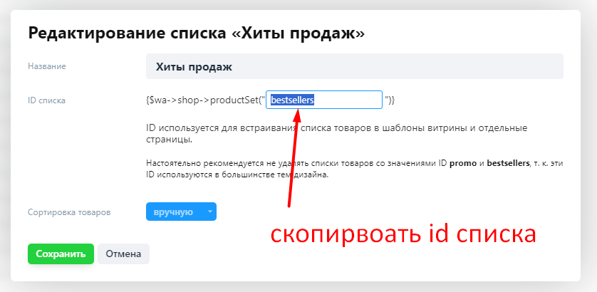 5. После создания списка товаров, в настройках списка скопируйте идентификатор (id) списка товаров: