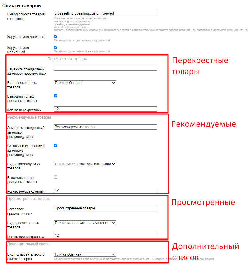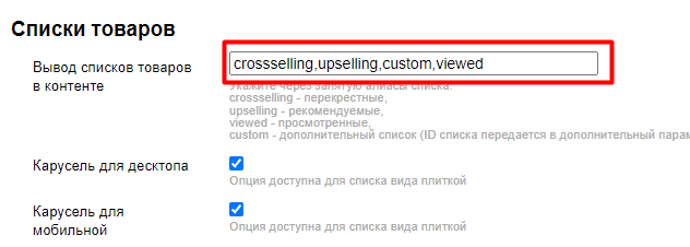 1. В карточке товара предусмотрен вывод следующих списков товаров: Перекрестные товары, Рекомендуемые товары, Просмотренные товары, Дополнительный (произвольный) список. Для вывода этих списков товара необходимо в настройках темы дизайна, в опции Вывод списков товаров в контенте (раздел "Карточка товара" / "Списки товаров") прописать алиасы: