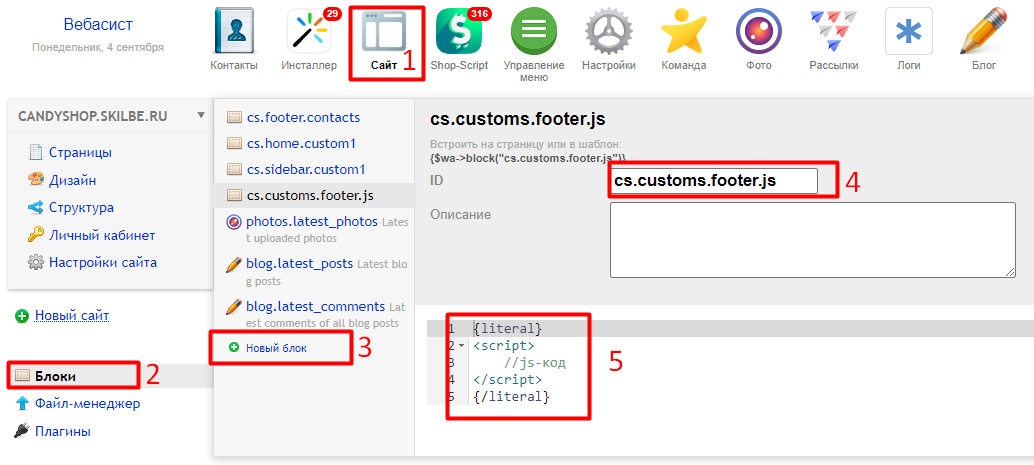 1. Для добавления js-скриптов перейдите в приложение Сайт -> Блоки, создайте блок с ID cs.customs.footer.js (для вывода скриптов в нижней части страницы) или cs.customs.head.js(для вывода скриптов в верхней части страницы). Весь код в блоке нужно вставлять между тегами {literal}{/literal}, как показано на скриншоте: