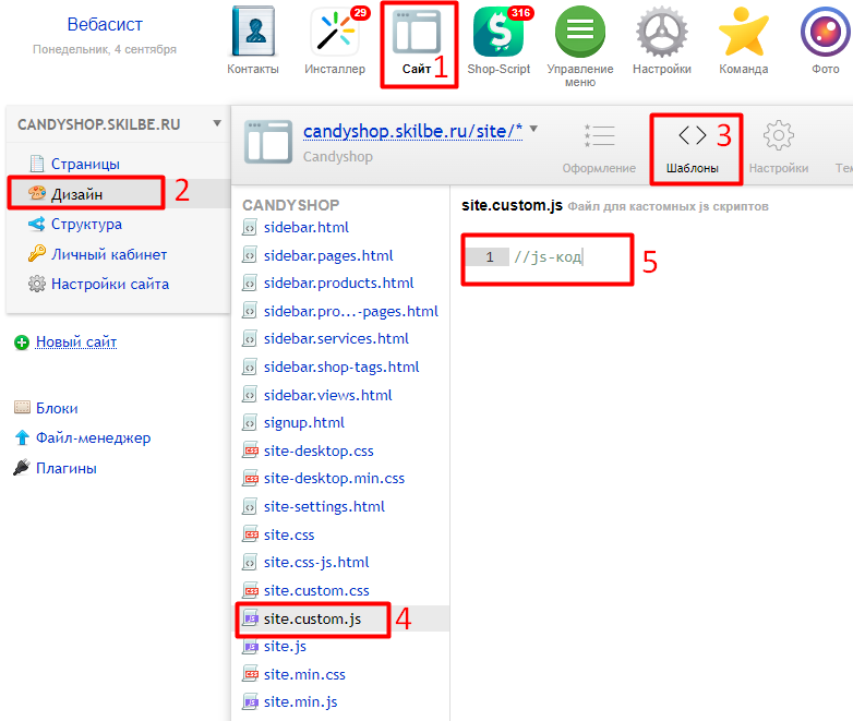 3. Далее, перейдите в приложение Сайт - Дизайн - Шаблоны, откройте файл site.custom.js: