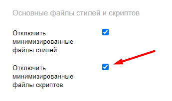 4. Для кастомных скриптов лучше использовать блок, а не файл. Если, необходимо редактировать оригинальные скрипты, то можно отключить подключение минимизирвоанных файлов опцией Отключить минимизированные файлы скриптов:
