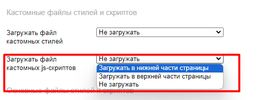 2. Также для js-скриптов можно использовать файл. Для этого необходимо включить опцию Загружать файл кастомных js-скриптов, в разделе "Оптимизация":