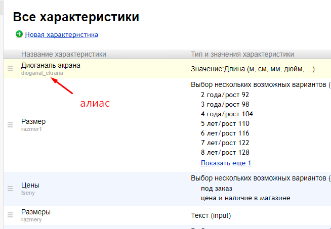 Алиас (или код) характеристики можно узнать в приложении Магазин - Настройки - Типы и характеристики товаров: