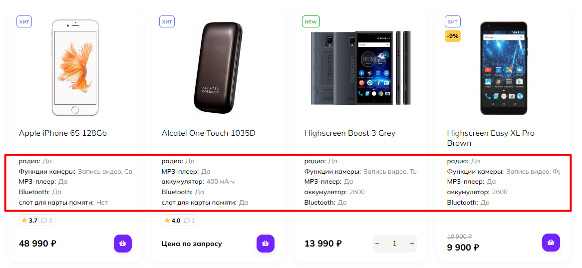 Вывод характеристик в превью товара