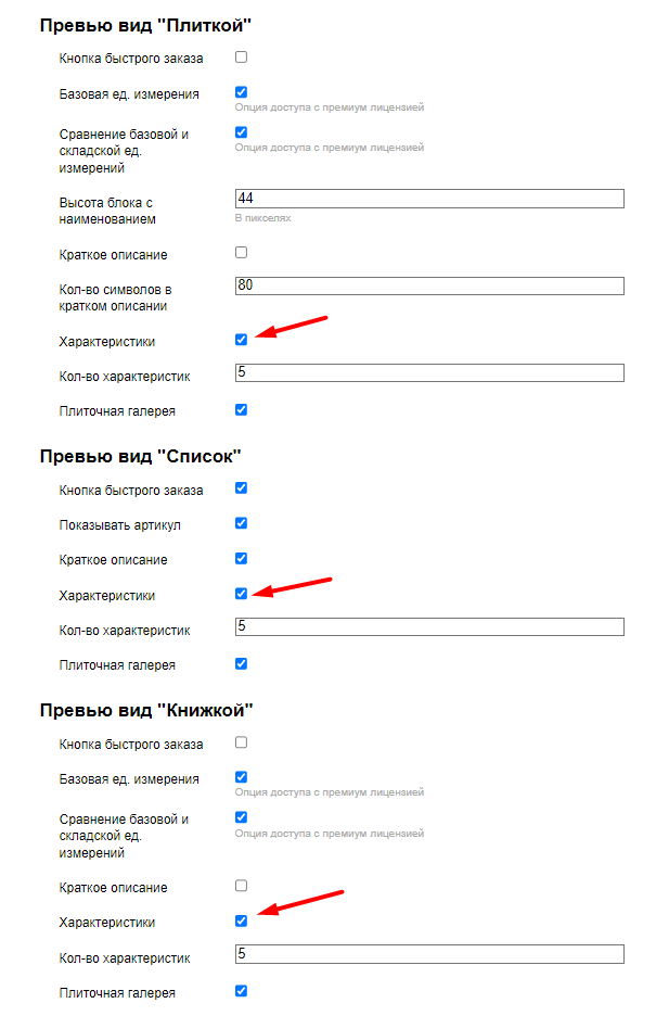 Для этого используйте опцию Характеристики в разделе "Превью товара" / "Превью вида "Плиткой" ("Превью вида "Список" и "Превью вида "Книжкой"):