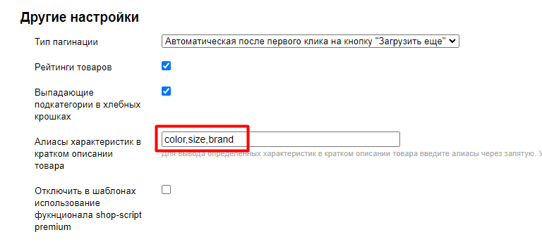 Чтобы вывести определенные характеристики, воспользуйтесь опцией Алиасы характеристик в кратком описании товара в разделе "Каталог" / "Другие настройки". Опцию необходимо заполнить алиасами характеристик, через запятую, без пробелов: