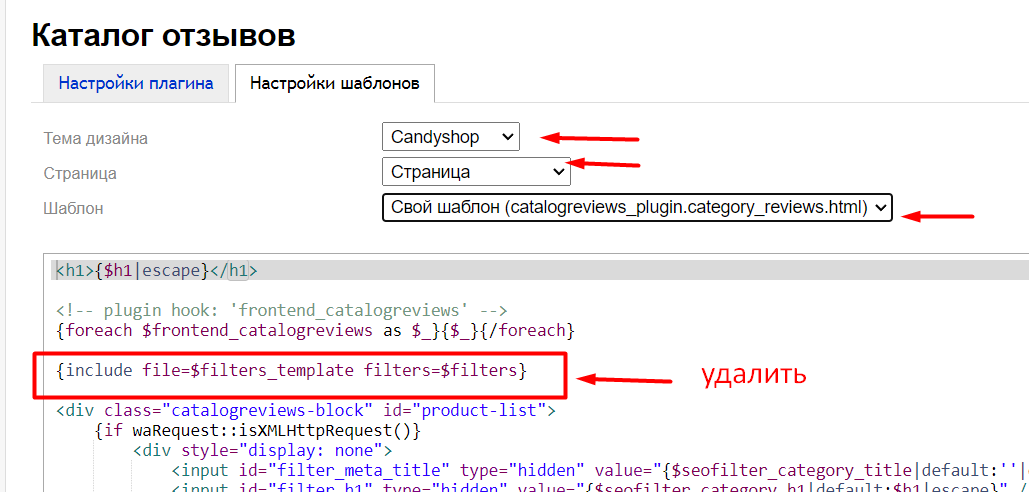 3. Перейдите в настройки плагина: приложение Магазин - Плагины - Каталог отзывов. Откройте шаблон "Страница" и удалите строчку: