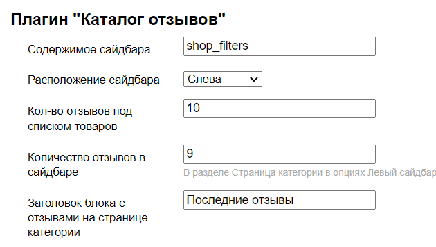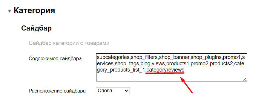 2. Последние отзывы можно вывести на странице категории под списком товаров или в сайдабаре. Для вывода в сайдбаре используйте алиас categoryreviews в опциях "Левый сайдбар" и "Правый сайдбар":