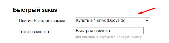 1) Для вывода кнопки, в настройках темы дизайна в разделе Каталог/Быстрый заказ для опции "Плагин Быстрого заказа" выберите вариант "Купить в 1 клик (от Bodysite)":