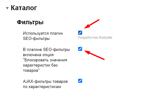 Если на вашем проекте используется плагин SEO-фильтры, то для использования хелперов плагина в шаблоне, необходимо включить опцию Используется плагин SEO-фильтры (раздел Каталог/Фильтры). Также при необходимости включите опцию В плагине SEO-фильтры включена опция "Блокировать значения характеристик без товаров":