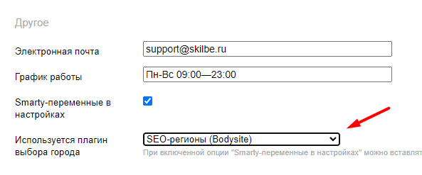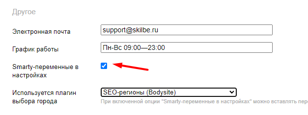 Для того чтобы в полях настроек (номер телефона, адреса, режима работы и тд.) вставлять переменные плагина (код smarty), необходимо включить опцию: "Обрабатывать статичные настройки через smarty":