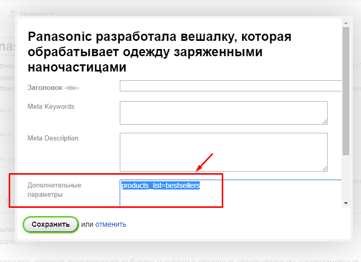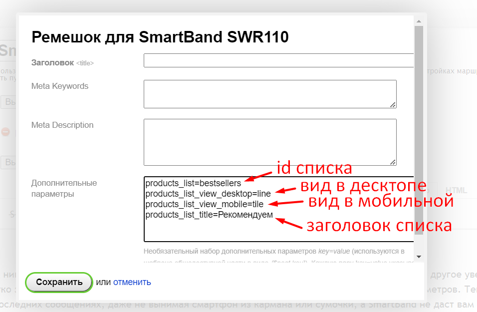 2) В поле "Дополнительные параметры" с новой строчки пропишите products_list=идентификатор списка:
