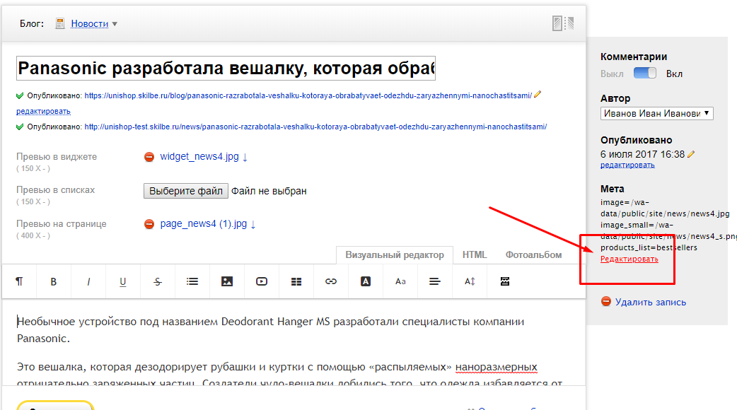 1) На странице поста блога можно вывести список товаров, для этого откройте в админ. панели сайта запись блога, далее нажмите в опции "Мета" ссылку "Редактировать":