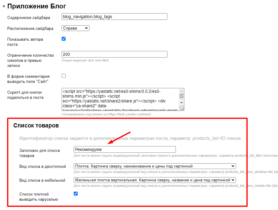 4) При необходимости можно отредактировать заголовок списка в настройках темы дизайна, опция "Заголовок для списка товаров" в разделе Приложение Блог / Список товаров:
