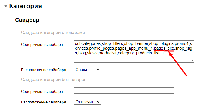 Опция Содержимое сайдбара предусмотрена для следующих разделов: - Главная страница, - Страница категории с товарами, - Страница категории без товаров, - Карточка товара, - Страница поиска, - Страница брендов, - Личный кабинет, - Страницы приложения Магазин, - Страницы приложения Сайт, - Приложение Блог, - Приложение Поддержка. Для этих разделов можно индивидуально настроить вывод блоков в сайдбаре: