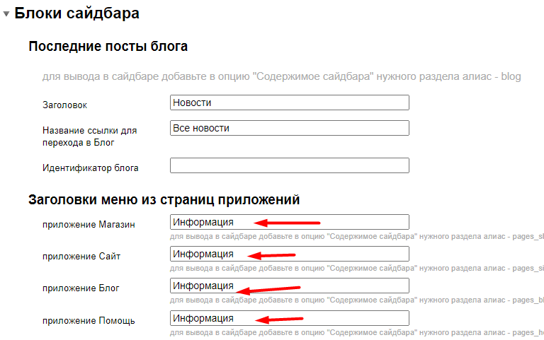 При необходимости заголовок меню можно поменять, используя опции в разделе "Блоки сайдбара" / "Заголовки меню из страниц приложений":