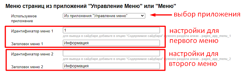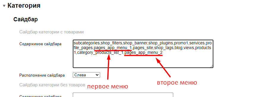 В сайдбаре можно вывести два произвольных меню из приложений Управление меню или Произвольное меню (приложения приобретаются отдельно). Для этого, необходимо добавить в опцию Содержимое сайдбара нужного раздела алиас меню pages_app_menu_1 (алиас первого меню) и pages_app_menu_2 (алиас второго меню):