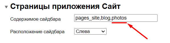 Для вывода последних фото в сайдбаре необходимо прописать алиас photos в опции Содержимое сайдбара нужного раздела сайта: