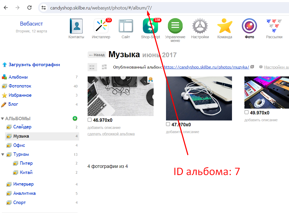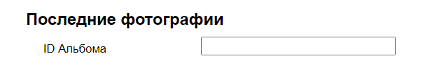 По умолчанию выводятся последние фото из всех альбомов. Если необходимо вывести из определенного альбома, необходимо воспользоваться опцией ID альбома. Идентификатор альбома можно узнать на странице альбома в админке, в адресной строке, например на скриншоте показан альбом с идентификатором 7: