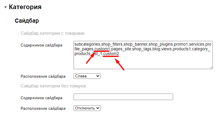 В сайдбар можно вывести до 2х блоков с произвольным содержимым. Для этого необходимо прописать алиас custom1 (для первого блока) и custom2 (для второго блока) в опции Содержимое сайдбара нужного раздела сайта: