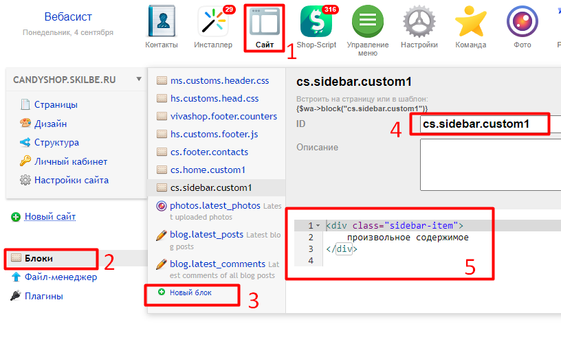 Далее, перейдите в приложении Сайт - Блоки и создайте блок с идентификаторами cs.sidebar.custom2 (для первого блока), cs.sidebar.custom2 и (для второго блока):