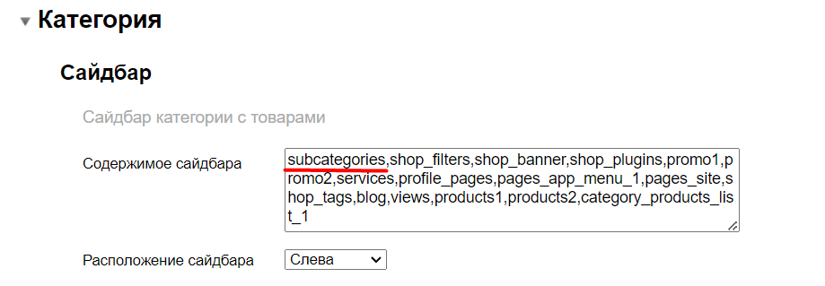 Для вывода подкатегорий в сайдбаре необходимо прописать алиас subcategories в опции Содержимое сайдбара в разделе "Категория" / "Сайдбар":