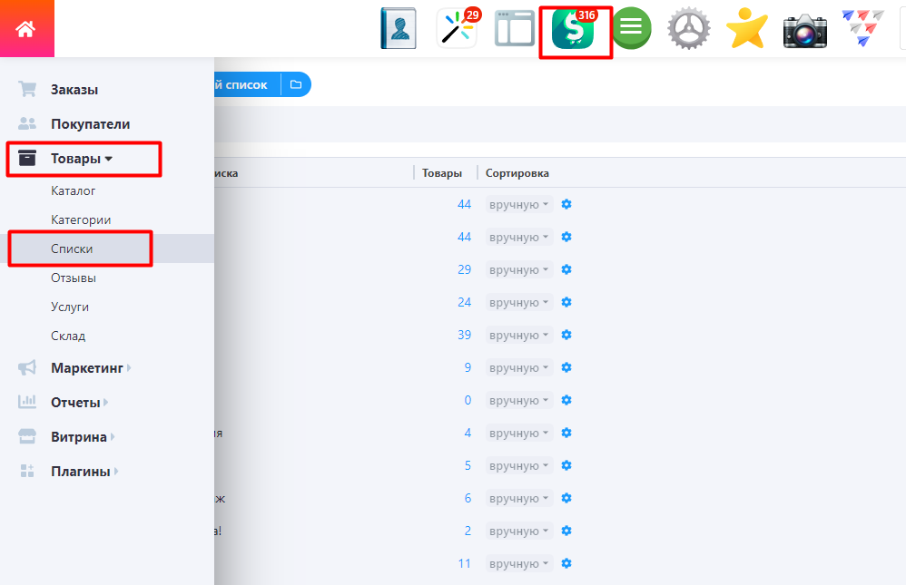 Далее, необходимо создать список товаров в приложении Магазин - Товары - Списки:
