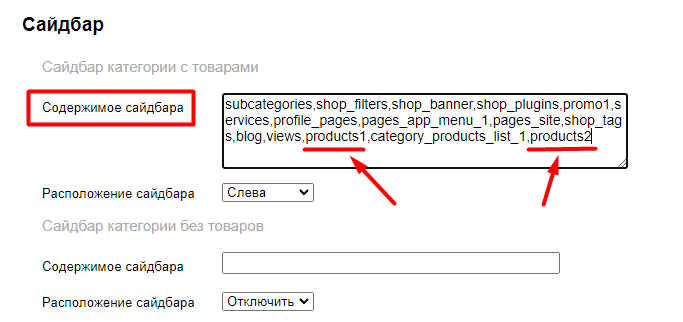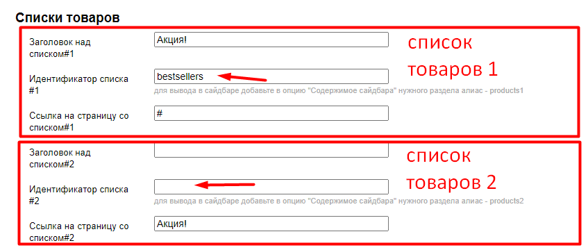 В сайдбаре можно вывести до 2х списков товаров. Для этого необходимо в опции Содержимое сайдбара прописать алиасы products1 - для первого списка и products2 - для второго списка:
