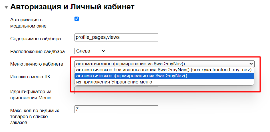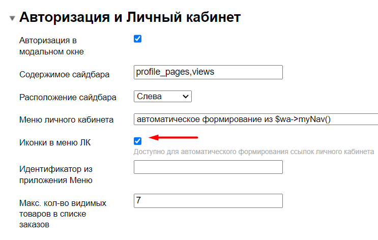 2. По умолчанию иконки выводятся для вариантов "автоматическое без использования $wa->myNav() (без хука frontend_my_nav)" и "автоматическое формирование из $wa->myNav()".