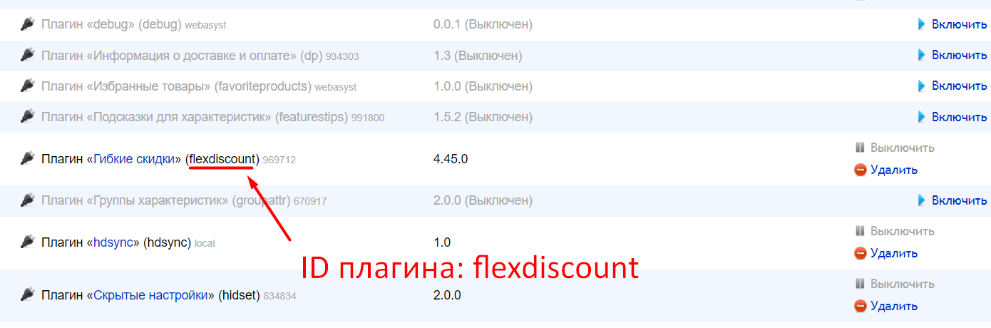 4. ID плагина можно узнать в инсталлере админки. Например, на скриншоте показан плагин с ID flexdiscount: