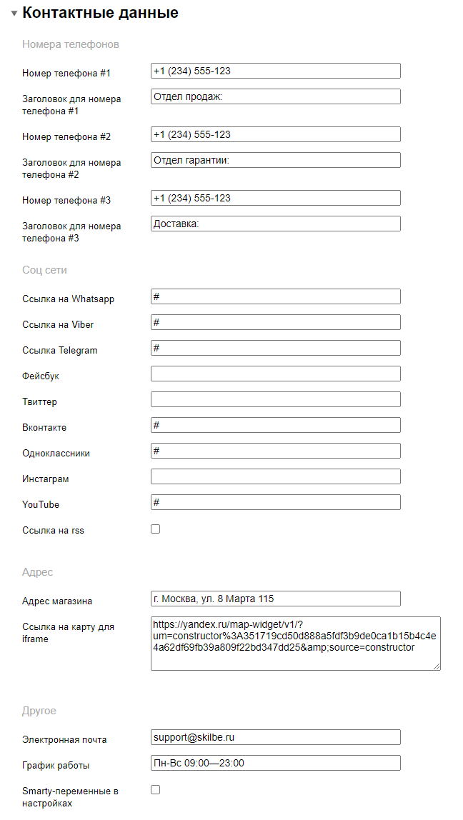 1. Адрес, телефоны и тд. заполняются в разделе "Контактные данные":