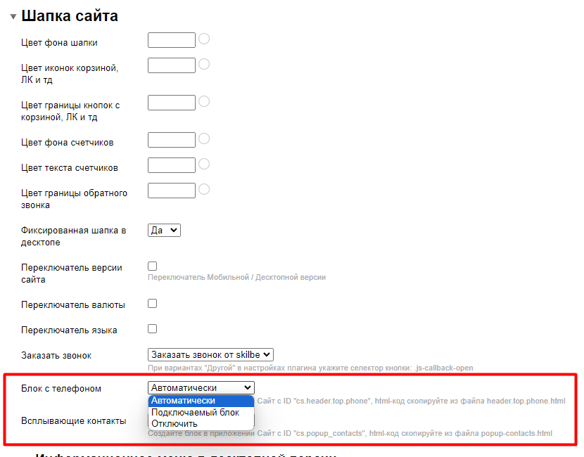 2. При необходимости блок с телефоном или всплывающие контакты можно отключить или отредактировать, используя опции: