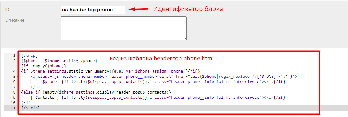3. Для редактирования блоков необходимо переключить на вариант "Подключаемый блок", далее перейти в приложение Сайт - Блоки и создать блоки с идентификаторами cs.header.top.phone (для блока с телефоном) и cs.popup_contacts (для всплывашки) и скопировать в содержимое блоков код из шаблонов header.top.phone.html (блок с телефоном) и popup-contacts.html (всплывашка) в приложении Сайт - Дизайн Шаблоны: