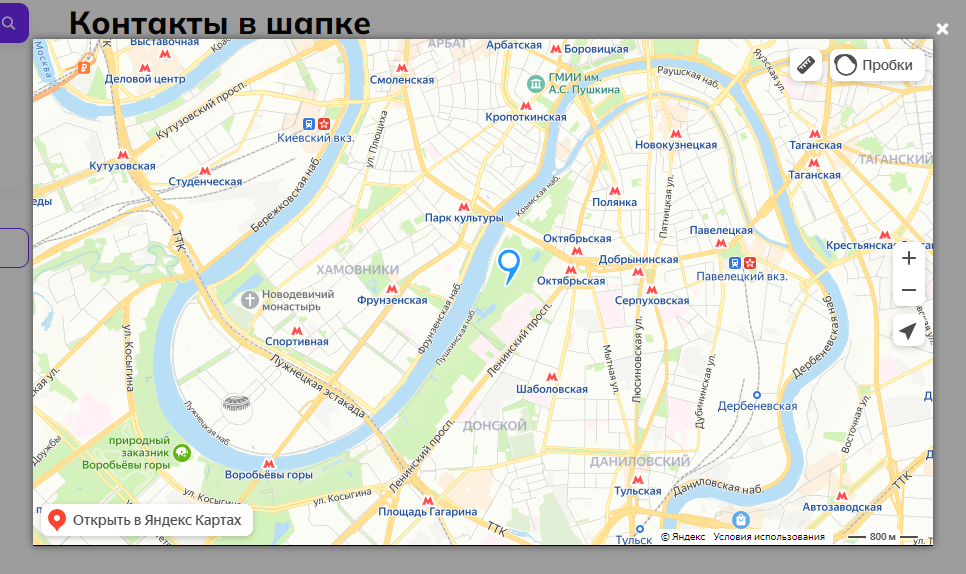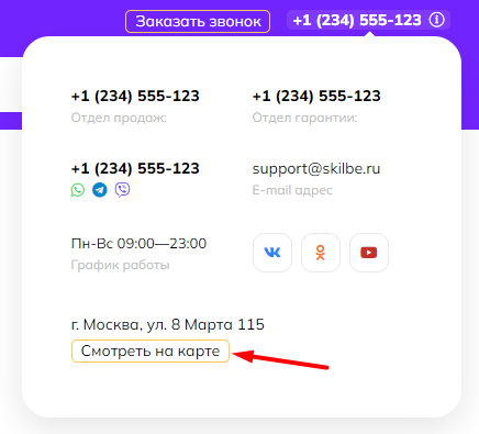 4. В попап-окне с контактами есть кнопка для просмотра адреса на карте: