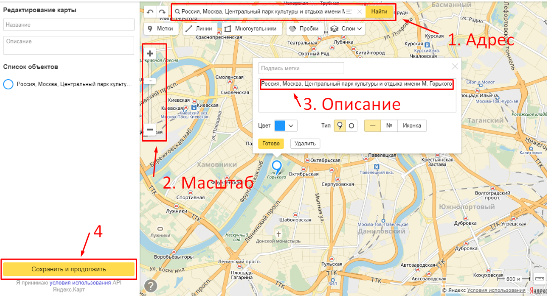 5. Чтобы получить ссылку для яндекс карты, перейдите в констуктов карт → Создать карту. Далее введите адрес, отрегулируйте масштаб карты, нажмите "Сохранить и продолжить":