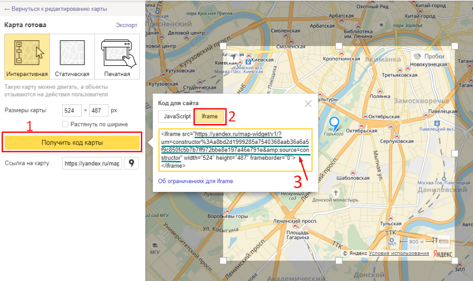 Далее "Получить код карты" → выберите тип iframe → из содержимого фрейма скопируйте значение атрибута src и вставьте в опцию Ссылка на карту для iframe