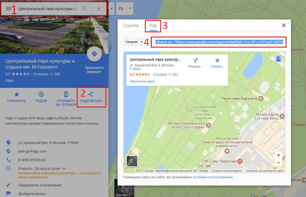 Чтобы получить ссылку для google карту, перейдите на google maps. Введите адрес → нажмите "поделиться" → выберите тип "Код":