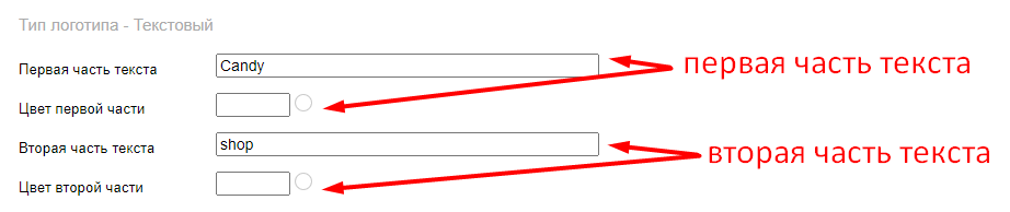 Текстовый логотип разделен на 2 части, для возможности назначить на части разный цвет. Если в логотипе планируется использовать один цвет, то настройки для второй части текста можно не использовать.